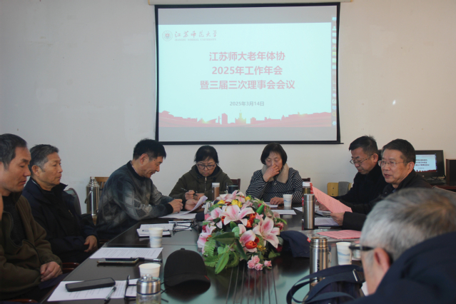 为贯彻落实省市和徐州高校老年体协有关会议精神和工作部署,进一步推进老年体育工作深入开展,3月14日上午,江苏师范大学老年体协2025年工作年会暨三届三次理事会会议在校离退休活动中心三楼会议室召开。江苏师大离退休工作处(部)副处(部)长杨际军,江苏师大老年体协名誉会长廉少纯,会长张光辉,副会长黄绍军、闫景义、焦正平,副会长兼秘书长张田军,财务理事王全爱,门球、交谊舞、健身舞、棋牌、乒乓球、太极拳、桌壶球等项目协会负责人(理事)以及离退处工作人员等参加会议。会议由副会长兼秘书长张田军主持。