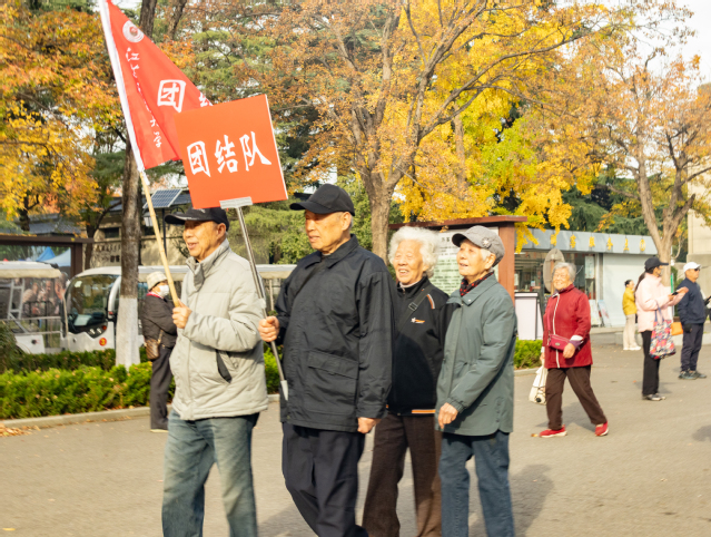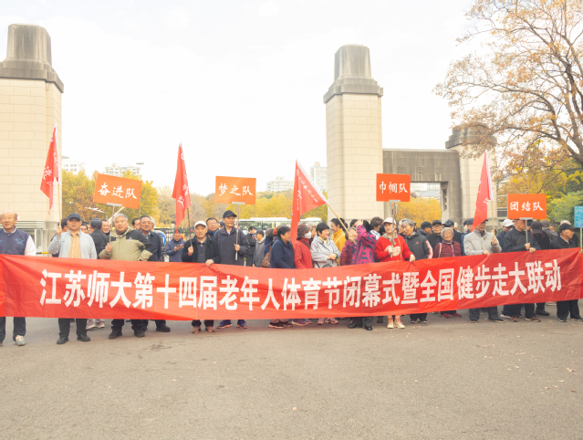 我校老年体协名誉会长廉少纯精神矍铄、声音洪亮地宣布:“江苏师范大学2025年全国老年人健步走大联动开始!”在鲜艳会旗的引领下,四个方队组织有序、呼应配合,队员们踏着激昂的《运动员进行曲》节拍,迈着矫健整齐的步伐,高喊“奋进昂扬,势不可挡”“夕阳正红,风采飞扬”等铿锵口号,沿园区主要路线健步前行。大家不仅在运动中收获了健康、快乐与友谊,也在庄重的红色氛围中接受了一次深刻的爱国主义与革命传统教育,进一步坚定了珍惜幸福生活、永葆银龄风采的信念。