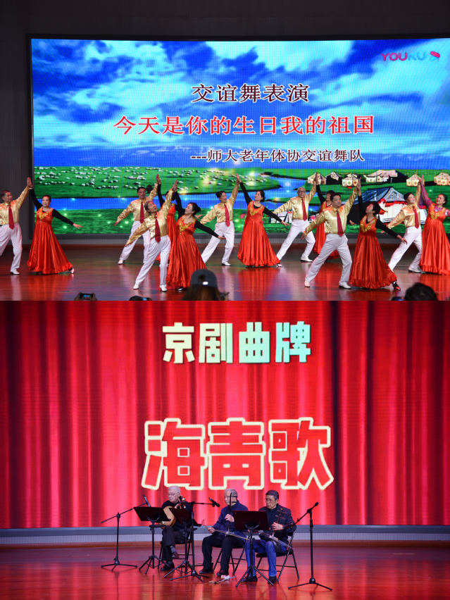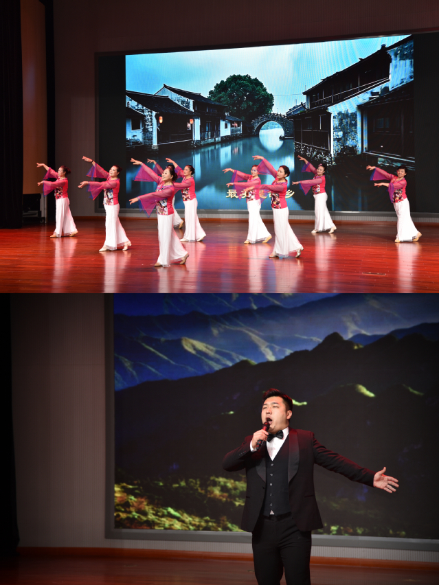 校情通报会后,团拜会文艺演出精彩上演。老同志们通过形式多样的节目展现出饱满的精神风采与艺术才情。牛山活动中心表演的养生艾草锤操《带你潇洒带你嗨》活泼开场,舞蹈《你是我心中的茉莉花》轻盈曼妙,别具一番清雅韵味。关工委青春咏诵团的老师们饱含深情朗诵《诗意中国》,抒发炽热的爱国情怀。老年体协的舞蹈《我把故乡比苏杭》舞姿翩跹,交谊舞《今天是你的生日》以祝福传递温馨。老年戏曲协会表演的京剧曲牌《海青歌》与清唱《洪羊洞》选段韵味醇厚,尽展国粹魅力。音乐学院教师专业助阵,独唱歌曲《爱永在》深情款款、打动人心,器乐重奏《自由探戈》以热情奔放的旋律点燃全场气氛。最后,全体离退休教职工齐声高唱《壮美延安》与《歌声与微笑》,铿锵而温暖的歌声回荡在整个会场,团拜会圆满落幕。